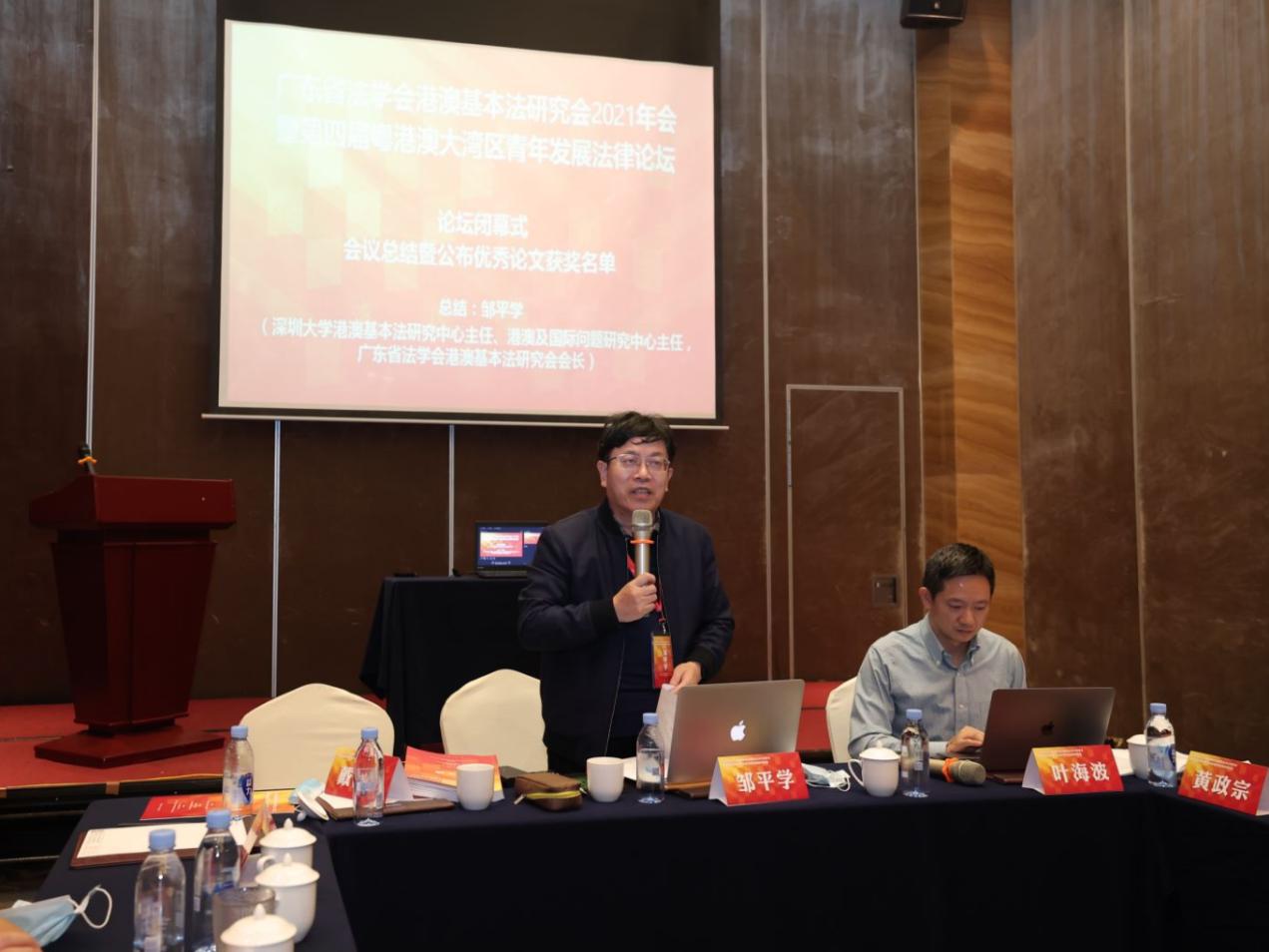 (图为研究会会长、深圳大学港澳基本法研究中心主任、深圳大学港澳及国际问题研究中心主任邹平学在闭幕式做总结发言)