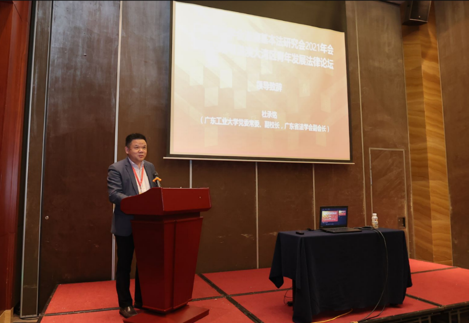 (图为广东省法学会副会长、广东工业大学党委常委、副校长杜承铭教授在开幕式致辞)
