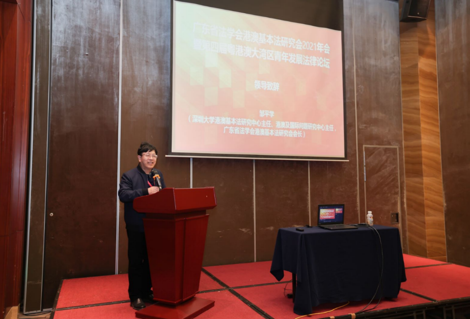 研究会会长、深圳大学港澳基本法研究中心主任、港澳及国际问题研究中心主任邹平学教授在致辞中表示,在我国第八个宪法日翌日,各位与会专家克服各种困难和不便在深圳齐聚一堂,迎来广东省法学会港澳基本法研究会2021年年会暨第四届粤港澳大湾区青年发展法律论坛的召开,不仅特别难得也值得纪念。他代表广东省法学会港澳基本法研究会,也代表承办方深圳大学港澳基本法研究中心向与会专家的光临和支持本次会议表示热烈的欢迎和衷心的感谢!此外,邹会长指出,从此次会议参加者之广和收录到的高质量参会论文之多,可以看出广东省港澳基本法研究的辐射力和影响力正不断扩大,希望研究会全体成员未来继续努力繁荣我省港澳基本法研究。此外,他也强调,在今年11月召开的中国共产党第十九届中央委员会第六次全体会议通过了《中共中央关于党的百年奋斗重大成就和历史经验的决议》,《决议》全面总结了党的百年奋斗重大成就和历史经验,并在有关港澳的部分作出了重要阐述,为我们当下和今后的研究指明了方向。他希望此次年会的每一位参与者都能继续坚持以习近平新时代中国特色社会主义思想为指导,深入学习贯彻习近平法治思想,围绕如何更好地坚持和完善“一国两制”制度体系,如何更好地支持和推动香港、澳门融入国家发展大局展开有深度、有价值的学术探讨,并且通过进一步深化港澳基本法实施和粤港澳大湾区法治建设的理论研究,更好地服务“一国两制”的伟大实践。