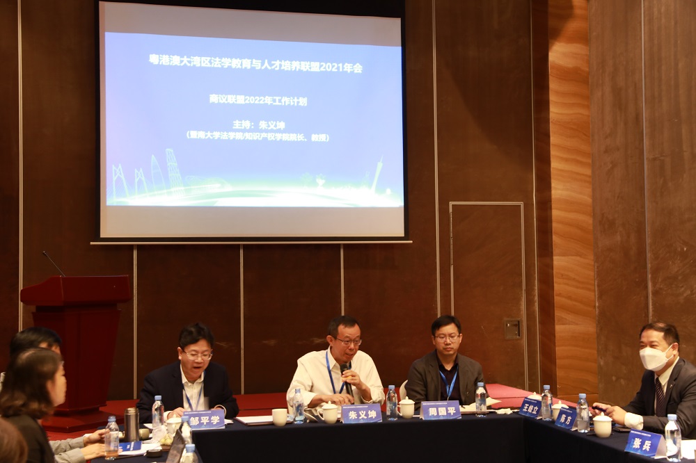 商议联盟2022年工作计划环节,由暨南大学法学院、知识产权学院院长朱义坤教授主持。香港大学法律学院赵云教授、香港中文大学法学院副院长习超教授、澳门大学法学院全球法律部高级导师李可、澳门科技大学法学院助理教授肖慧娜、中山大学港澳台事务办公室副主任古文力、华南理工大学法学院讲师朱珊珊、华南师范大学沈虹副教授,广东外语外贸大学港澳台办副主任周鹏,广东财经大学法学院副院长谢伟教授,广州大学法学院副院长周少华教授等10位发言人分别发言,畅谈对联盟2022年工作的建议和设想。会议最后由深圳大学港澳基本法研究中心主任邹平学教授进行总结。