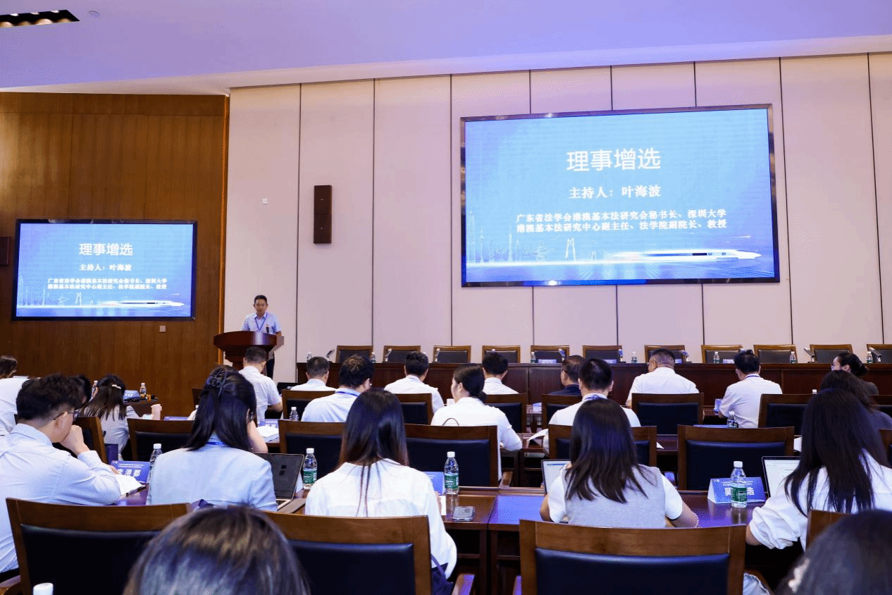 9:35-10:55,年会进入大会主题报告环节,研究会副会长、汕头大学法学院院长邓剑光教授与研究会秘书长、深圳大学港澳基本法研究中心副主任、法学院副院长叶海波教授担任主持。广东省法学会副会长、广东工业大学副校长杜承铭教授,澳门大学法学院教授、宪法与基本研究中心主任蒋朝阳,研究会副会长、华南理工大学党委统战部常务副部长夏正林教授,研究会副会长、中国社会科学院法学研究所贺海仁研究员分别以“湾区涉外法治与涉外法治人才培养的若干思考”、“爱国者治澳制度与机制”、“香港特别行政区政治体制再反思”、“论全面依法治理特别行政区——习近平法治思想中港澳纳入国家治理体系重要论述的学理阐释”为题作了主题发言。