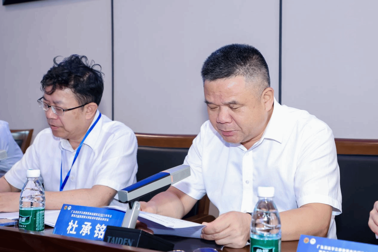 杜承铭在致辞中首先代表广东省法学会对莅临本次大会的领导来宾表示诚挚欢迎,对长期以来关心与支持法学会工作的同仁表示衷心感谢。他指出,过去一年港澳基本法研究会始终坚持正确政治方向,紧密围绕党和国家港澳工作大局,提交了一份突出体现我省港澳研究优势与实力、获得上级部门与领导充分肯定的答卷,有力地推动了我省乃至全国港澳研究共同体的建设。在对研究会所取得的良好工作成效表示祝贺以及对研究会所有工作人员的辛勤付出表达敬意之后,他指出研究会应继续对港澳基本法实施的新情况、新挑战开展深入研究,并对研究会未来工作提出三点希望:第一,继续服务中央港澳工作大局,围绕重大政策开展深度研究。第二,聚焦粤港澳大湾区发展中的新情况、新问题。第三,加强人才建设和学术创新,提升研究影响力。最后,他希望研究会不忘立会初心,牢记目标使命,以更强烈的政治责任感、更饱满的学术热情和更丰硕的研究成果,共同推动港澳基本法的深入实施,开创粤港澳大湾区更加美好的未来。