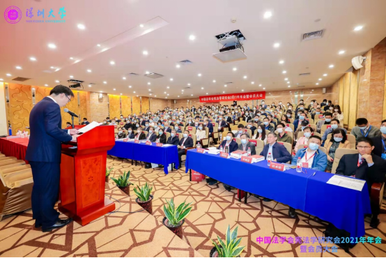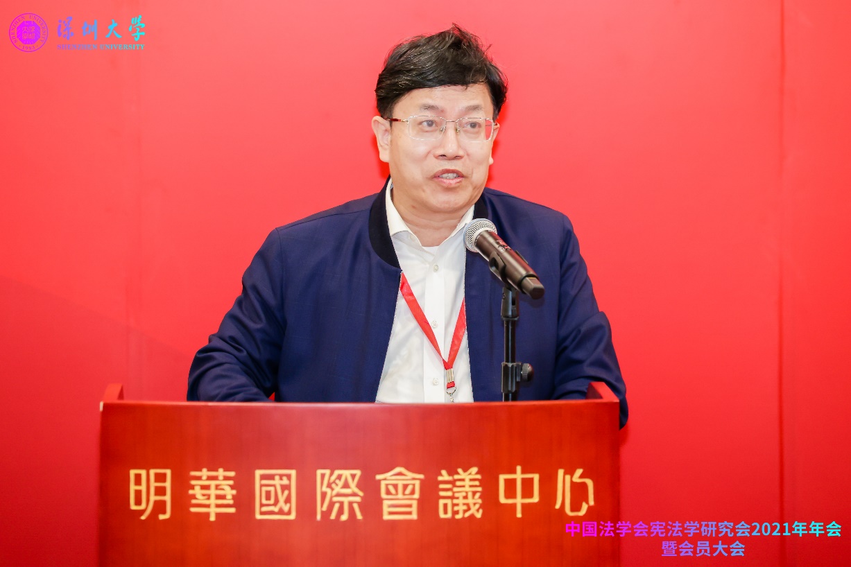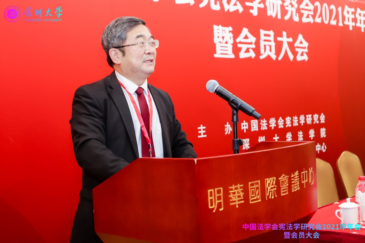 中国法学会宪法学研究会2021年年会暨会员大会是在中国共产党成立100周年之际举行的,主题为“中国共产党与中国特色社会主义宪法道路”,由中国法学会宪法学研究会、深圳大学法学院、深圳大学港澳基本法研究中心共同主办。中国法学会党组成员、副会长王其江,十三届全国人大常委会委员、全国人大宪法和法律委员会委员、中国法学会副会长郑淑娜,中国法学会宪法学研究会会长、中国人民大学法学院教授韩大元,中共广东省委政法委二级巡视员、广东省法学会副会长姜滨,中共深圳市委常委、政法委书记、市法学会会长余新国,深圳大学副校长张晓红等嘉宾出席会议开幕式。