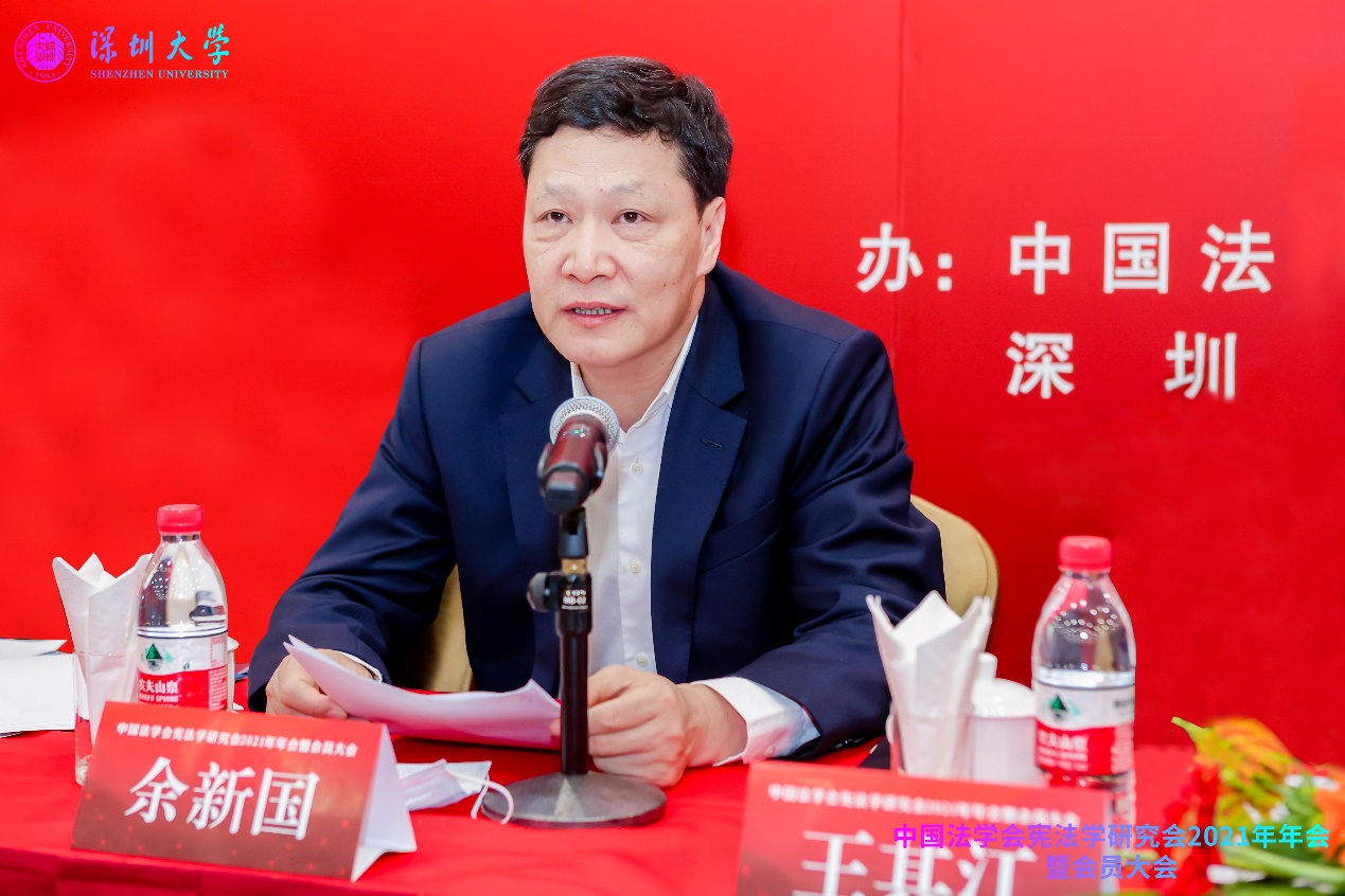 中共深圳市委常委、政法委书记、市法学会会长余新国对出席年会的领导、专家学者和嘉宾表示热烈欢迎,对大家一直以来给予深圳法治建设的关心、支持和帮助表示衷心感谢。他指出,这是中国法学会宪法学研究会首次在深圳举办年会,必将对深圳的法治建设产生积极影响,也将对我国宪法学研究和宪法实施产生深远影响。近年来,深圳始终坚定沿着总书记指引的方向奋勇前进,将深化法治建设摆在更加重要的战略位置。深圳作为中国特色社会主义忠实实践地,在改革开放中发挥了积极作用,为国家法治建设和宪法的修正提供了丰富素材和鲜活的经验。希望各位嘉宾一如既往的关心支持深圳的法治建设,为把深圳打造成为中国特色社会主义法治的窗口和名片提出更多宝贵意见,贡献更多智慧成果。
