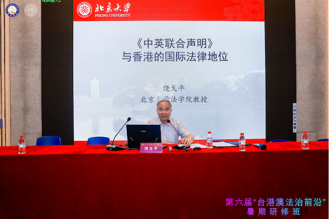 随后,北京大学法学院饶戈平教授在汇星楼报告厅为研修班学员作第一场学术讲座,主题为“《中英联合声明》的效力问题与香港的国际法律地位”。饶戈平教授的学术讲座主要从《中英联合声明》的签署及其效力展开论述,对国际上各方力量围绕《中英联合声明》产生的争论和冲突进行了分析评论,对关涉香港国际地位的一些错误观点进行了重点批驳,并从国际法角度阐述了香港特别行政区对外事务权的性质与有限的国际法律人格。