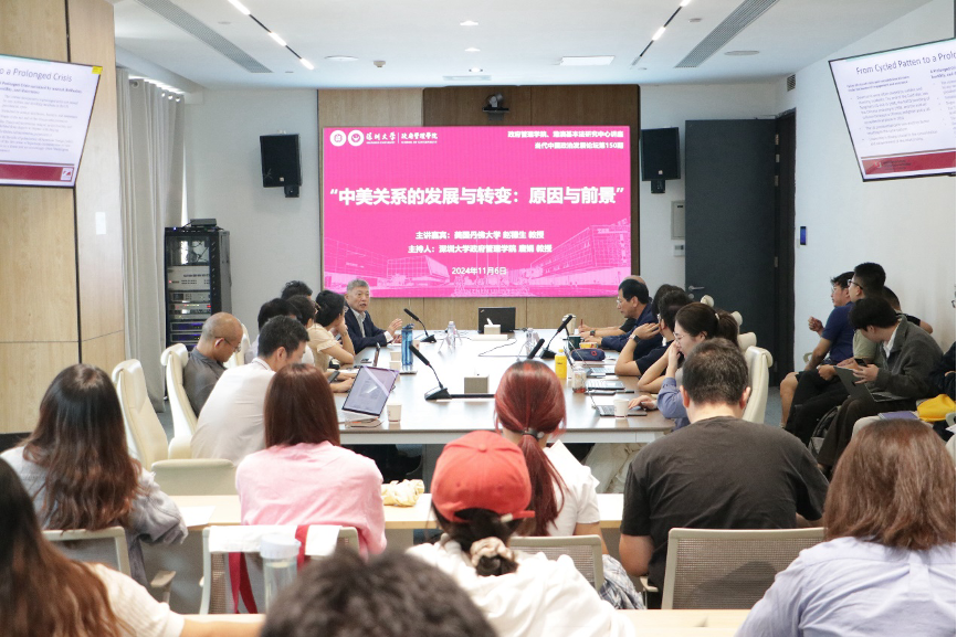 11月6日,深圳大学港澳基本法研究中心、港澳与国际问题研究中心与深圳大学政府管理学院在丽湖校区成功联合举办“港澳与国际问题论坛”第6讲:《中美关系的发展与转变:原因与前景》,邀请美国丹佛大学赵穗生教授主讲。讲座由政府管理学院唐娟教授主持,学院院长俞可平教授、港澳基本法研究中心主任邹平学教授出席,40余名师生参加。