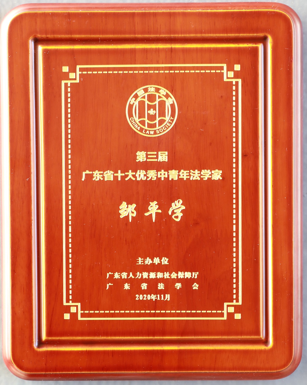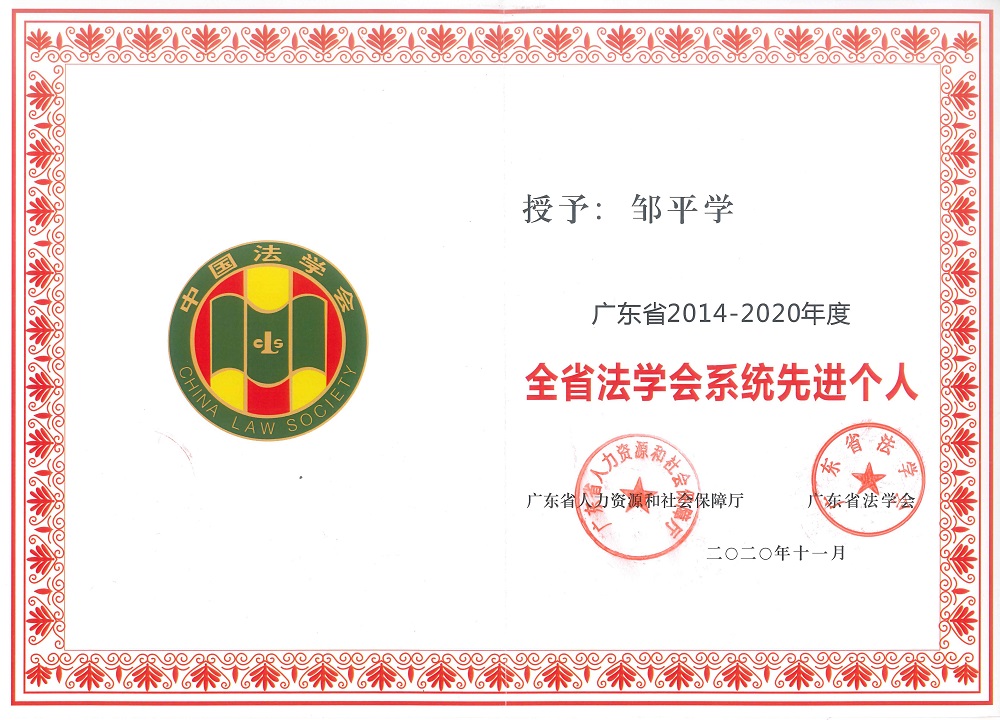 会议上,梁伟发同志代表省法学会第八届理事会作工作报告。何广平同志宣读《广东省人力资源和社会保障厅 广东省法学会关于表彰广东省2014-2020年度全省法学会系统先进集体、先进个人和第三届“广东省十大优秀中青年法学家”的决定》,并为获奖集体和个人代表颁发证书。邹平学教授荣获第三届“广东省十大优秀中青年法学家”及广东省2014-2020年度全省法学会系统先进个人称号。广东省法学会香港基本法澳门基本法研究会荣获“广东省2014-2020年度全省法学会系统先进集体”称号,该研究会秘书处设在深圳大学港澳基本法研究中心,现任会长为邹平学教授。