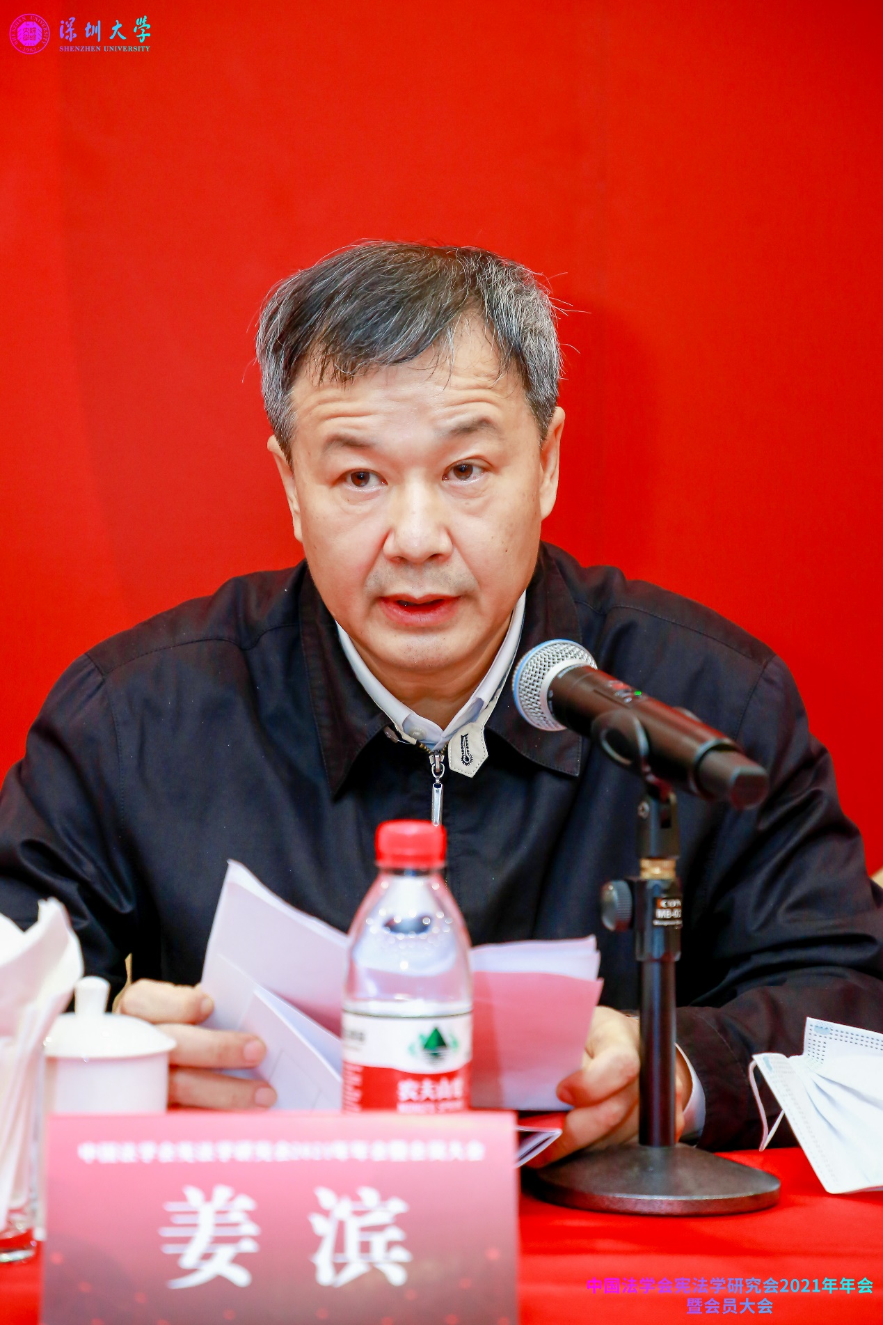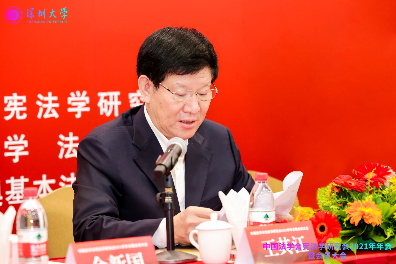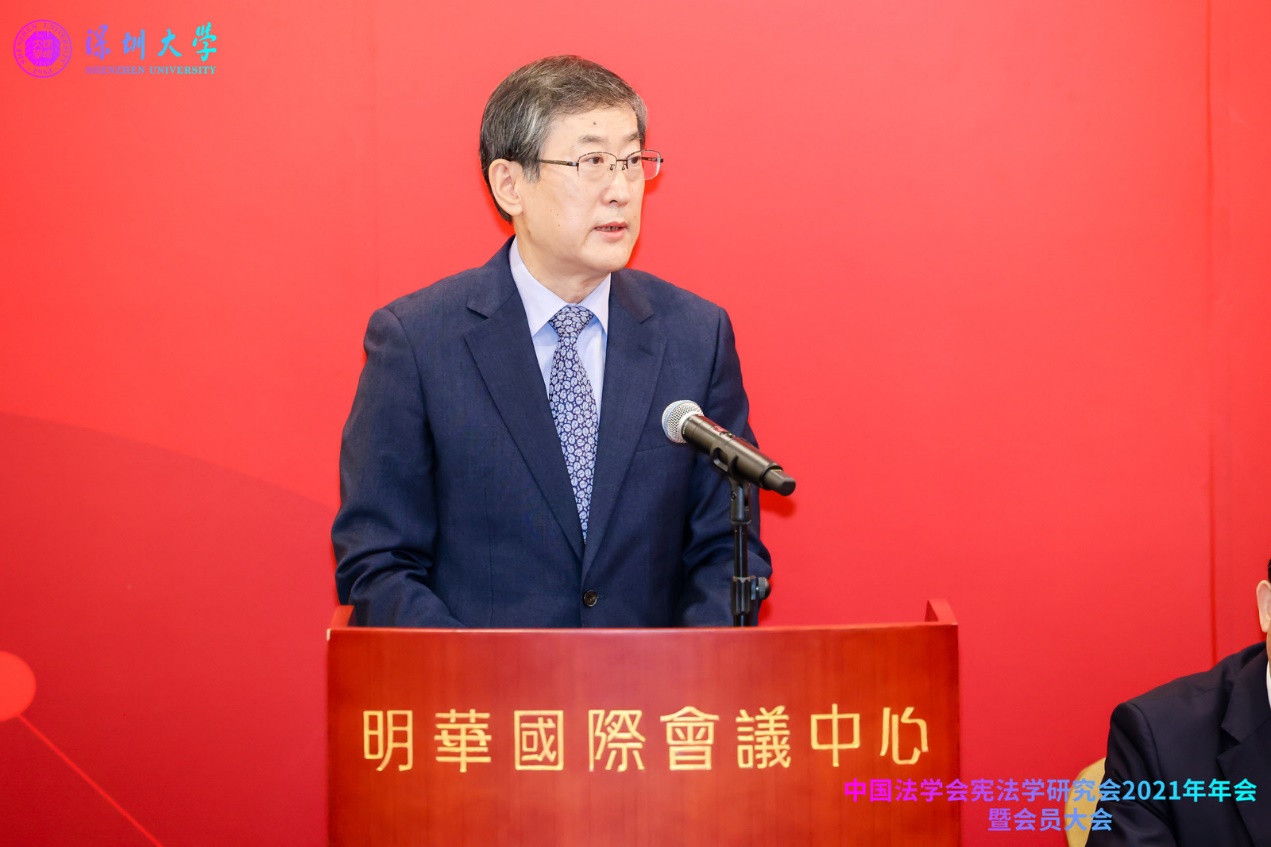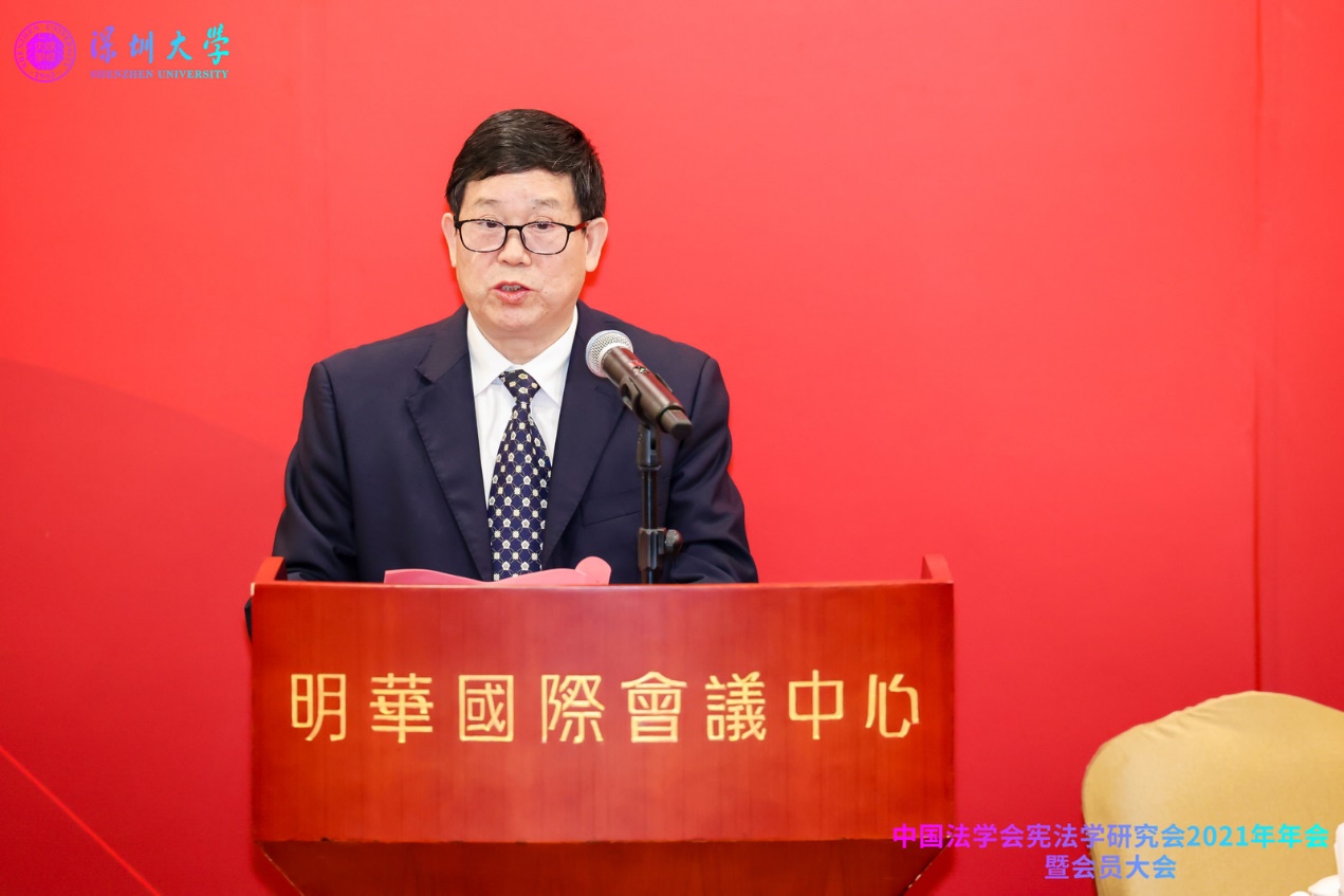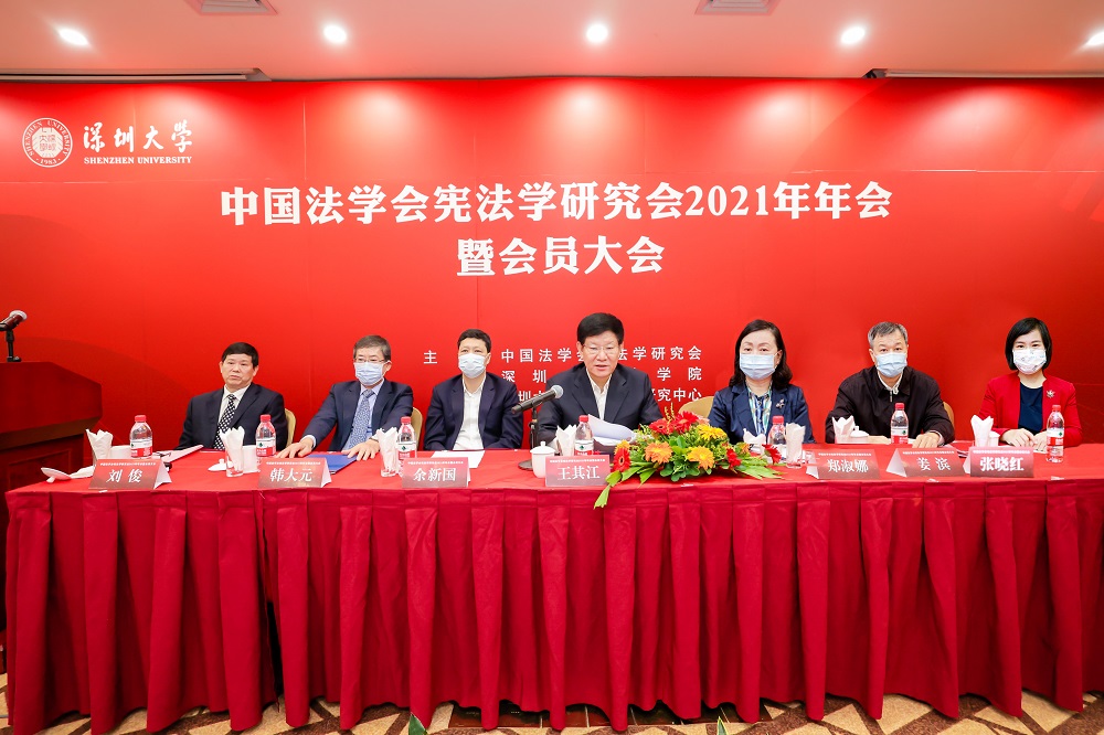 中国法学会宪法学研究会2021年年会暨会员大会是在中国共产党成立100周年之际举行的,主题为“中国共产党与中国特色社会主义宪法道路”,由中国法学会宪法学研究会、深圳大学法学院、深圳大学港澳基本法研究中心共同主办。中国法学会党组成员、副会长王其江,十三届全国人大常委会委员、全国人大宪法和法律委员会委员、中国法学会副会长郑淑娜,中国法学会宪法学研究会会长、中国人民大学法学院教授韩大元,中共广东省委政法委二级巡视员、广东省法学会副会长姜滨,中共深圳市委常委、政法委书记、市法学会会长余新国,深圳大学副校长张晓红等嘉宾出席会议开幕式。