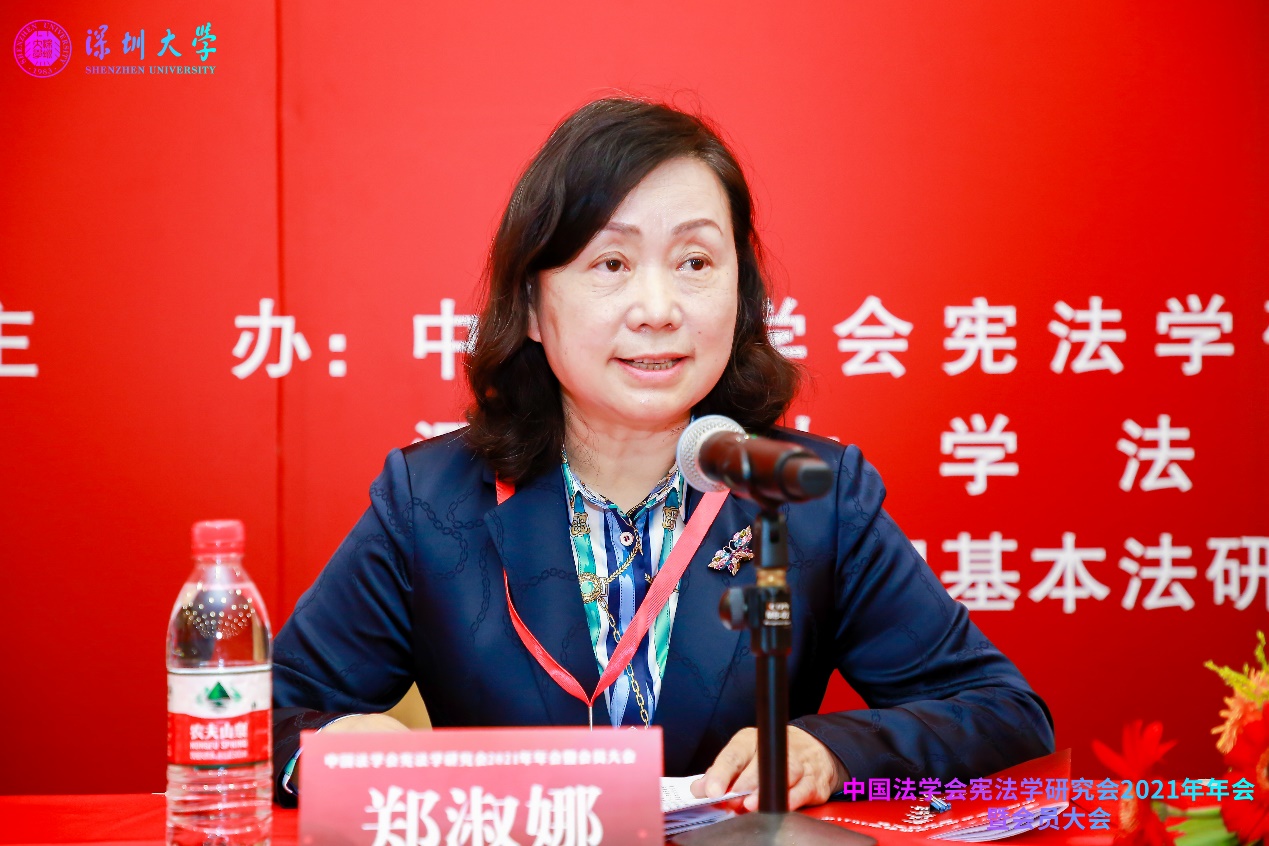 在中国法学会宪法学研究会2021年年会暨会员大会的闭幕式上,新当选的中国法学会宪法学研究会会长郑淑娜发表讲话。郑淑娜会长指出,按照法定程序,宪法学研究会新一届理事会已经顺利产生。这次换届工作要求高。在中国法学会党组的直接领导下,在上一届会长韩大元教授的认真组织下,按要求、按规定,在统一思想、统一认识的基础上,经过各方面积极努力,顺利完成了这次换届工作,为下一阶段各项工作的开展打下了良好基础。郑淑娜会长说,我谨代表本届中国法学会宪法学研究会理事会,向韩大元教授、向上一届理事会的同志们表示由衷的敬意和感谢,向新当选的本届理事会表示祝贺,也向本次年会承办方深圳大学法学院和深圳大学港澳基本法研究中心表示感谢。郑淑娜会长指出,上一届宪法学研究会在韩大元教授的领导下,风清气正,精诚团结,学术成就斐然,真正成为了宪法学界交流思想、分享成果的精神家园。新一届研究会既要保持这样的态势,又要将其发扬光大,共同努力,再创辉煌。她指出,宪法学研究会过去几年的工作是卓有成效的,中国法学会对此予以高度肯定,要全力维护好宪法学研究会这个宪法学者的共同家园。在党和国家事业发展的新征程中,宪法在治国理政中的重要地位和作用,决定了宪法学研究必定大有可为。她代表新一届理事会表示:一是继续坚持研究会学术定位,以学术标准、学术秩序合理安排研究会各项工作,引领宪法学者继续以研究会作为交流学问、展示成果和自我成长的最重要平台;二是继续大力扶持青年学者成长,提供优质支持,搭建宽广平台,使宪法学研究事业吸引人才、留住人才,为国家培养人才,让更多青年宪法学者加入研究会,让优秀青年宪法学者尽快补充到研究会负责人、常务理事等重要岗位上来;三是继续发扬团结、和谐、尊重的研究会精神,在研究会长期健康向上的发展中,实现每一位学者学术生涯的进步和发展。最后,她指出,中国特色社会主义进入新时代,站在新的百年奋斗历史新起点上,全面推进依法治国、建设社会主义法治国家,宪法学人有义不容辞的责任,要不断增强“四个意识”、坚定“四个自信”、做到“两个维护”,凝神聚气,彼此鼓励,共同为中华民族伟大复兴的事业贡献宪法学力量。