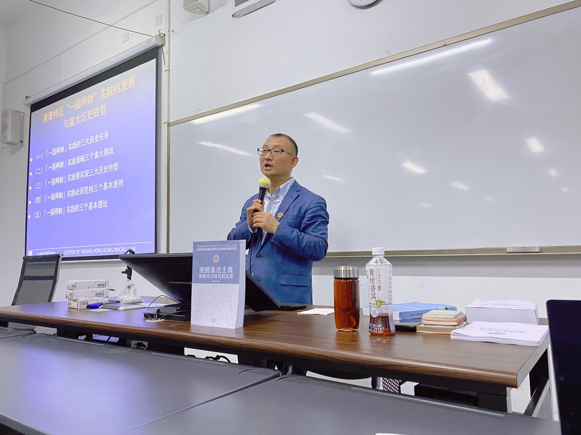 5月27日,深圳大学港澳基本法研究中心成立15周年系列学术活动“港澳论坛”第35讲在沧海校区致理楼顺利举行。本次港澳论坛邀请到南开大学法学院副教授、台港澳法研究中心执行主任李晓兵作为主讲人,演讲主题为“港澳特区‘一国两制’实践发展与重大历史转型”,中心黎沛文副教授主持讲座。