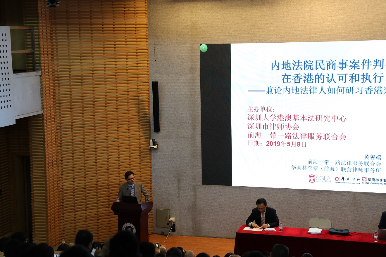 5月8日下午,由深圳大学港澳基本法研究中心、深圳市律师协会和深圳市前海一带一路法律服务联合会(以下简称“联合会”)主办的香港法系列讲座第6讲《内地法院民商事案件判决在香港的认可和执行——兼论内地法律人如何研习香港判例法》在深圳大学科技楼二号报告厅成功举办。讲座由联合会副秘书长黄善端担任主讲嘉宾。讲座得到深圳市中级人民法院、深圳国际仲裁院和前海合作区人民法院支持,深圳大学师生、深圳法律界人士和部分企业代表共计250余人出席。